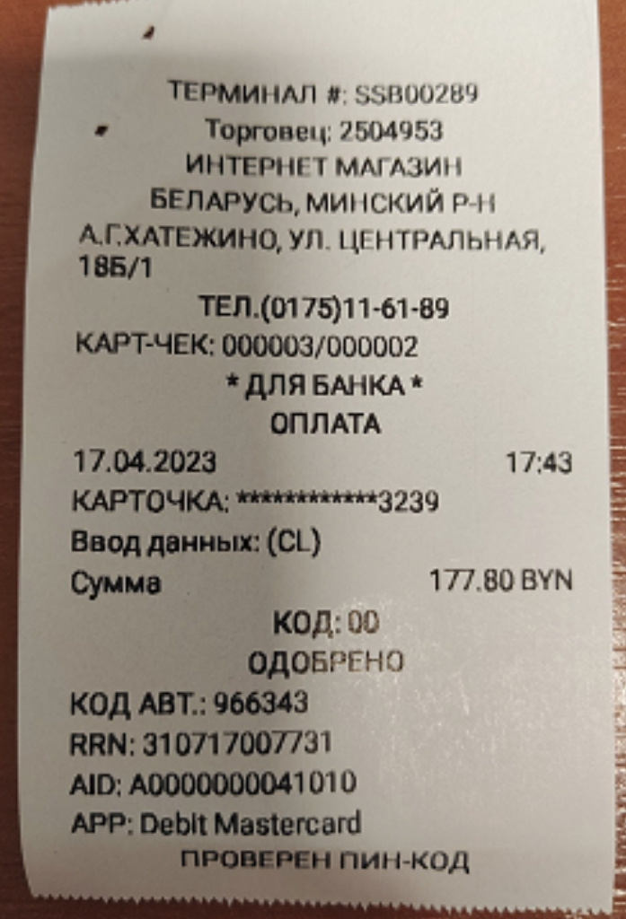 При оформлении заказа через сайт укажите способ оплаты «Карточкой при доставке». В этом случае у нашего курьера будет с собой терминал, с помощью которого вы сможете оплатить покупку пластиковой банковской карточкой VISA, Master Card, Belcard.