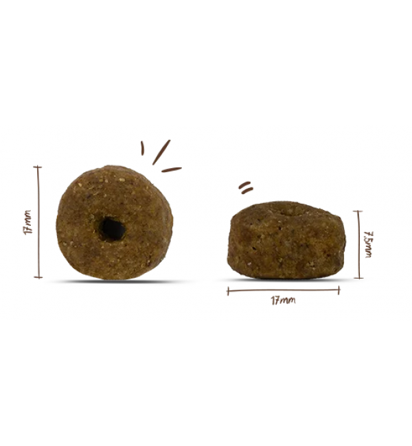 Состав: Свежие личинки черной львинки Hermetia illucens (20 %), картофель (сушеный, 15,5 %), горох (сушеный, 15 %), гороховый крахмал, картофельный белок, тапиока (сушеная, 6 %), лососевое масло, чечевица (сушеная), льняное семя, гидролизат белка (вегетарианский), дикальцийфосфат, дрожжи (сушеные, в т.ч. 0,1 % маннанолигосахаридов, 0,06 % бета-глюканов), яблоко (сушеное, 1 %), гороховая клетчатка, карбонат кальция, хлорид натрия, клюква (сушеная, 0,1 %), зеленые мидии (сушеные, 0,1 %), цикорий (сушеный).