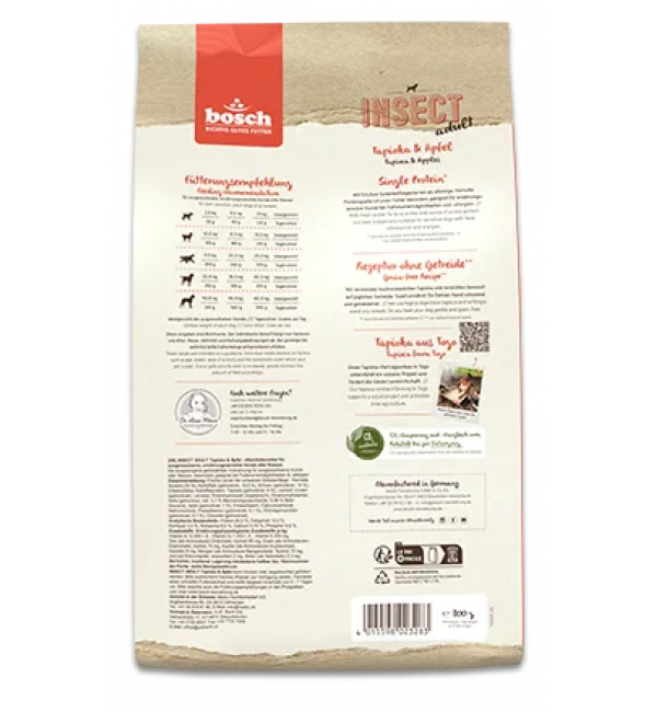 Бош Инсект Эдалт Тапиока с Яблоком - это единственный животный белковый продукт для сбалансированного и полноценного питания взрослых собак всех пород. Благодаря свежим насекомым в качестве единственного источника животного белка и легкоусвояемой тапиоке вы можете баловать вашу собаку мягко, естественно и без зерна. Мы используем только несколько видов особо качественного сырья в нашей композиции, чтобы сделать состав понятным и облегчить кормление собак с пищевой непереносимостью и аллергией.