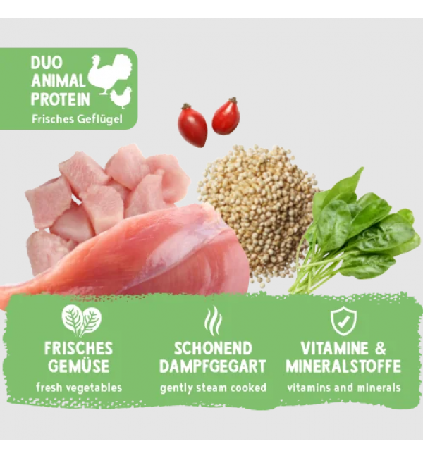 Свежая индейка (34 %), свежая курица (20 %), вареный бульон, свежая морковь (6 %), киноа (5 %), свежий шпинат (3 %), белок птицы (гидролизованный), уксус, шиповник (сушеный, 0,2 %), карбонат кальция, подсолнечное масло (0,1 %), свекла (сушеная), хлорид натрия.