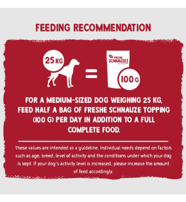 Для собаки среднего размера весом 25 кг — полпакетика FRESHE SCHNAUZE Topping (100 г) в день в дополнение к полноценному корму.