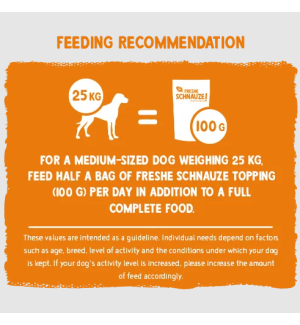 Для собаки среднего размера весом 25 кг — полпакетика FRESHE SCHNAUZE Topping (100 г) в день в дополнение к полноценному корму.