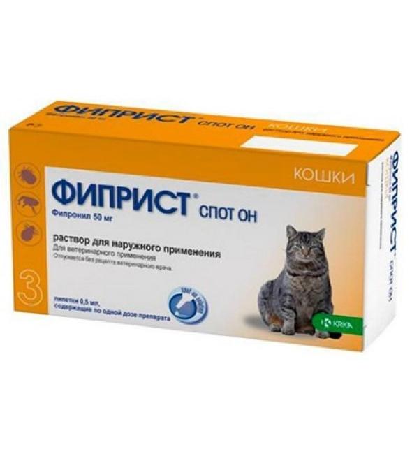 Фиприст Спот Он применяют животным путем однократного топикального нанесения на сухую неповрежденную кожу, используя пипетки различной фасовки (в зависимости от вида и массы животного). Перед обработкой кончик пипетки прокалывают перевернутым колпачком, раздвигают у животного шерсть в области спины (между лопатками) и, нажимая на пипетку, наносят препарат на кожу в одну или несколько точек в следующих дозах: кошки 0,5 мл - 1 пипетка. Повторные обработки животных проводят по показаниям, но не чаще одного раза в четыре недели. В целях предотвращения повторной инфестации животных блохами рекомендуется обрабатывать собак, обитающих совместно, а также заменить подстилки или обработать их инсектицидным средством в соответствии с инструкцией по его применению. Для лечения отодектоза Фиприст Спот Он закапывают в каждое ухо по 4 - 6 капель (капли обязательно вводят в оба уха). Для равномерного распределения препарата ушную раковину складывают пополам и слегка массируют ее основание. Остаток препарата в используемой пипетке (в расчете на массу животного) наносят на кожу между лопаток (однократная обработка). При осложнении отодектоза отитом назначают противомикробные и противовоспалительные средства. Не следует мыть и купать животное в природных водоемах в течение 48 часов после обработки, а также наносить препарат на влажную или поврежденную кожу.