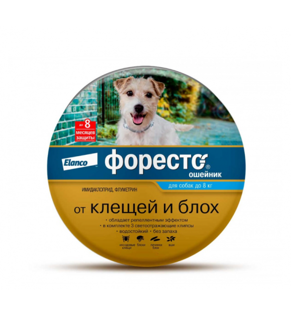 Ошейник Форесто (Foresto) – инновационное средство для защиты собак и кошек от клещей и блох на протяжении 8 месяцев. Подходит для щенков старше 7-недельного возраста и котят старше 10-недельного возраста, а также беременным и кормящим животным. Ошейник Форесто (Foresto) выпускается в двух вариантах: для собак до 8 кг (длина ошейника 38 см) и для собак более 8 кг (длина ошейника 70 см). В комплекте к ошейнику идут три светоотражательные клипсы, которые помогают следить за животным в темноте. Защита на весь сезон. Ошейник обеспечивает защиту домашних питомцев от клещей и блох на протяжении 8 месяцев. Действующие вещества выделяются из ошейника дозированно и по необходимости, «умная» матрица ошейника контролирует этот процесс. Уничтожение паразитов ДО укуса. Ошейник обладает репеллентным, т.е. отпугивающим действием на насекомых и клещей. Паразит попадает на животное, но не может закрепиться, так как подвергается отпугивающему действию препарата, так называемому «эффекту обожженных ног». После такого взаимодействия с кожей и шерстью животного паразит падает с него и погибает в окружающей среде. Мыть животное можно, не снимая ошейник Форесто (Foresto). Активные компоненты ошейника заключены в его полимерной матрице, которая не реагирует на воду. Отсутствие запаха у ошейника связано с тем, что компоненты ошейника не пахнут и выделяются из него в микродозах.