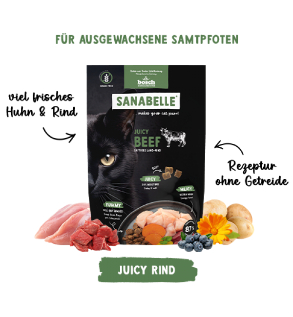 Для настоящих любителей мяса среди ваших пушистых друзей: Sanabelle Juicy с сочной говядиной добавляет дополнительную дозу разнообразия и удовольствия в миску вашей кошки – каждый день. Мягкий, ароматный корм сочетает в себе особенно высокую долю свежей говядины из домашней говядины и нежного куриного мяса, заставляя даже самых привередливых кошек мурлыкать от восторга.