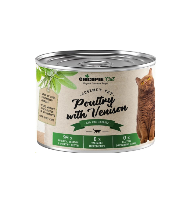 Консерва Чикопи для взрослых котов (домашняя птица с олениной) с морковью 195гр