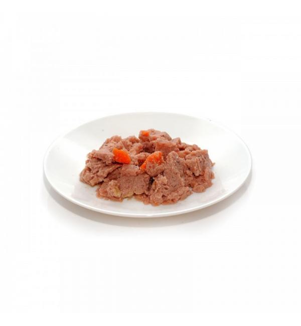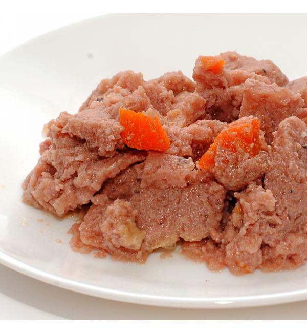 Утка (смесь мяса, печени, сердец, шеек) 41 %, утиный бульон 27 %, курица (смесь мяса, печени, сердец, шеек) 26 %, морковь 4 %, рисовая мука 1 %, минералы 1 %.