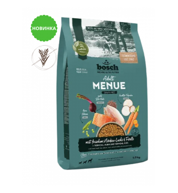 Корм Bosch для собак HPC МЕНЮ со свежим лососем и форелью из Северного моря. Корма для домашних животных Bosch — это разнообразный хрустящий корм для сбалансированного и полезного рациона для вашей взрослой собаки в возрасте от 12 месяцев.