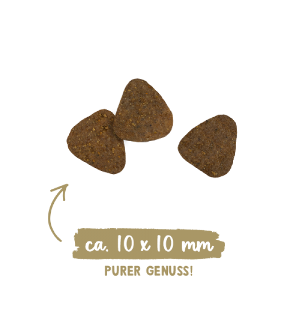 Состав: мясо птицы (свежее, 20 %), белок из птицы (сушеный), рис, рисовая мука, животный жир, свежая печень (5 %), белковый гидролизат, шкварки (сушеные), мука, сушеный свекольный жом (обессахаренный), льняное семя (1,5 %), мука из лосося (1,5 %), масло лосося (1,5 %), гороховые волокна, дрожжи (сушеные, в т. ч. 0,1 % маннанолигосахаридов, 0,06 % бета-глюканов), хлорид калия, карбонат кальция, ягоды брусники (сушеные), ягоды голубики (сушеные), зеленые мидии (сушеные), цветы календулы (сушеные), цикорий салатный (сушеный), юкка (сушеная).
