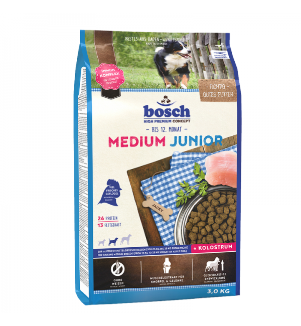 Корм Medium Junior произведён на основе свежего мяса домашней птицы, что придаёт ему великолепную вкусовую привлекательность. Использование экстракта зеленогубчатого моллюска благотворно влияет на развитие хрящей и суставов животного. Благодаря содержанию молозива и специфического иммунного комплекса маннанов и глюканов (разработанных ветеринарами), корм способствует укреплению иммунной системы молодого организма собаки. Форма и размер гранул специально адаптированы для собак средних пород.