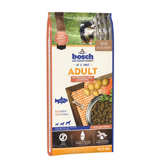 Сухой корм для собак ADULT WITH FRESH SALMON & POTATO с лососем и картофелем произведён на основе свежего лосося, а также легко усваиваемого картофеля. Свежий лосось обеспечивает организм собаки высококачественным белком и имеет высокий уровень незаменимых жирных кислот для кожи и шерсти животного. Специальный состав обеспечивает комфорт для собак с чувствительным пищеварением. Использование экстракта зеленогубчатого моллюска благотворно влияет на укрепление хрящей и суставов животного. Благодаря содержанию специфического иммунного комплекса маннанов и глюканов (разработанных ветеринарами), корм способствует укреплению иммунной системы организма собаки. Форма и размер гранул специально адаптированы для взрослых собак всех пород.