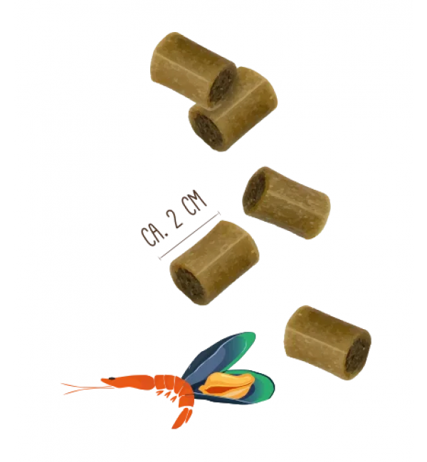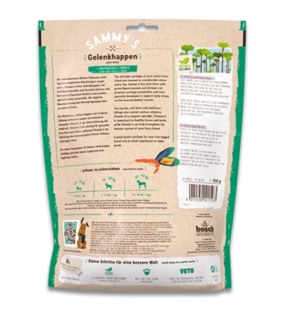 Лакомство Сэмми легко усваивается и и приятно хрустит за счет бережной сушки на свежем воздухе. Нежная обработка подчеркивает естественный вкус всех используемых высококачественных ингредиентов. Суставные хрящи у активных собак ежедневно подвергаются значительным нагрузкам. Лакомство Сэмми с зеленогубчатым маллюском и креветками способствуют повышению метаболизма и восстановлению хрящевой ткани у собак. Покажите свою настоящую любовь к питомцу.