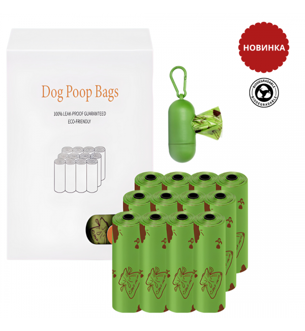Набор диспенсер + 12 рулонов по 15 биоразлагаемых пакетов (180 шт) для выгула собак