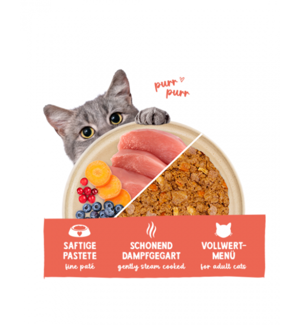 - Бережно приготовленный на пару влажный корм для взрослых кошек